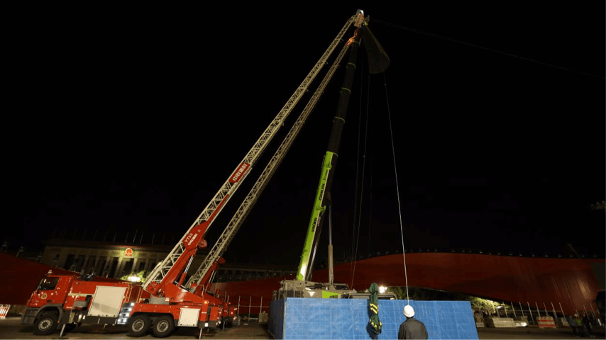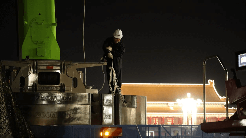 ▲中聯(lián)重科汽車起重機(jī)聳立在天安門廣場(chǎng)架設(shè)天鷹座拍攝系統(tǒng)助力大慶直播