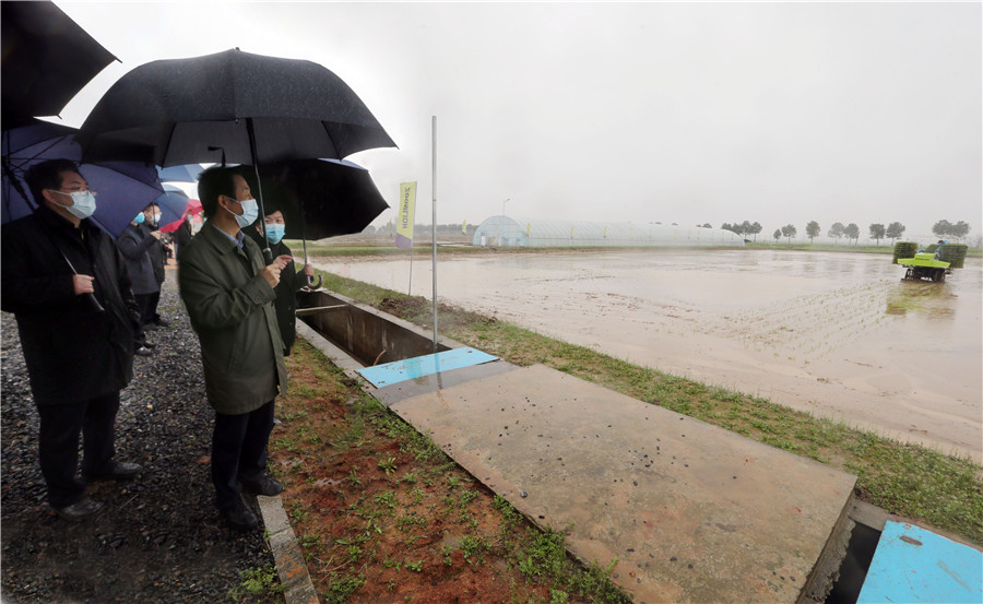 △許達(dá)哲觀看中聯(lián)重科智慧農(nóng)機(jī)產(chǎn)業(yè)園新下線的高速有序拋秧機(jī)演示拋秧作業(yè)。圖片來源:新湖南客戶端