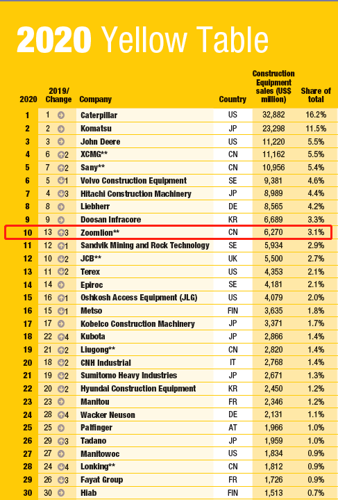 ? ?近日,英國KHL集團發(fā)布了一年一度的全球工程機械制造商50強排行榜《2020 Yellow Table》。榜單顯示,中聯(lián)重科以60多億美元的銷售總額位列榜單前十強,充分凸顯了中聯(lián)重科近年來取得的高質量、高效率、可持續(xù)發(fā)展成果。