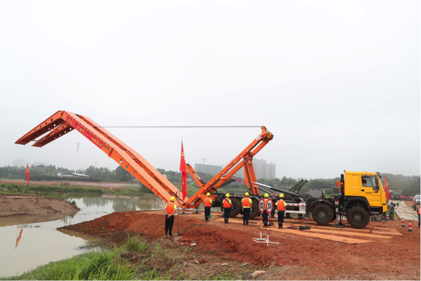 △中聯(lián)重科應(yīng)急架橋車正在搭建臨時(shí)橋梁