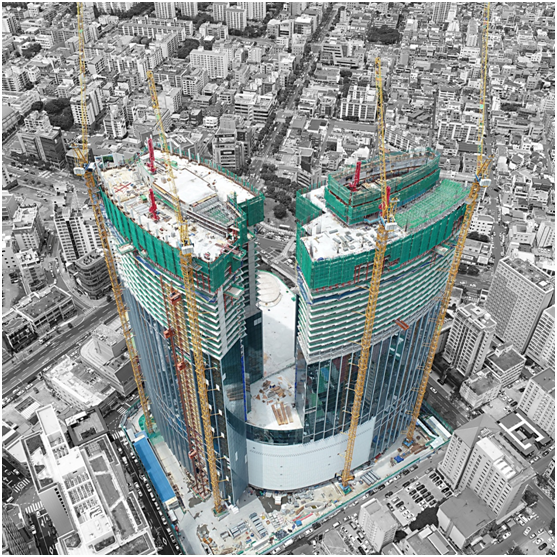△中聯(lián)重科塔機(jī)群在韓國(guó)一線建筑公司大宇建設(shè)某項(xiàng)目工地施工