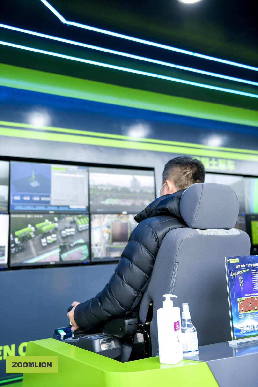 展臺前方,是中聯(lián)重科充滿未來感、前沿感的純電動汽車起重機的智能吊裝演示,以及混凝土泵車動態(tài)演示;展臺右側(cè),則是塔機、泵車、挖掘機設(shè)備的5G遠程操控體驗中心,客戶親身的操作、體驗、感受,讓設(shè)備的“智能化”功能可觸、可感、可見。