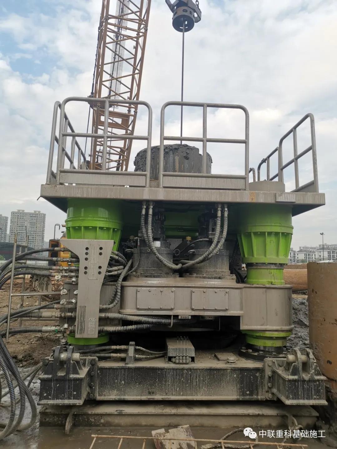 此次杭州項目工地臨近地鐵,周邊居民小區(qū)眾多,對施工設(shè)備的降噪標(biāo)準(zhǔn)有著非常高的要求,且該項目工況極為復(fù)雜——該樁長較長,且成樁過程中需穿越溶洞、巖層、流沙層等復(fù)雜地層進(jìn)行地下灌注樁施工,若采用傳統(tǒng)施工工藝則難度較大,安全風(fēng)險較高。項目施工方綜合考慮,**終決定使用中聯(lián)重科全回轉(zhuǎn)鉆機(jī)進(jìn)行一次性全套管跟進(jìn)來實現(xiàn)成孔成樁。