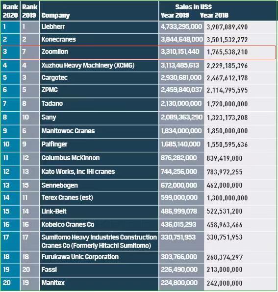 △中聯(lián)重科位列全球起重機械制造商20強排行榜**三