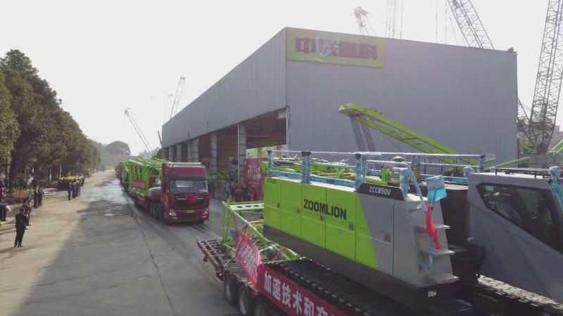 △2月18日,中聯(lián)重科開門紅當天,十余臺履帶起重機明星產品起運發(fā)往全球