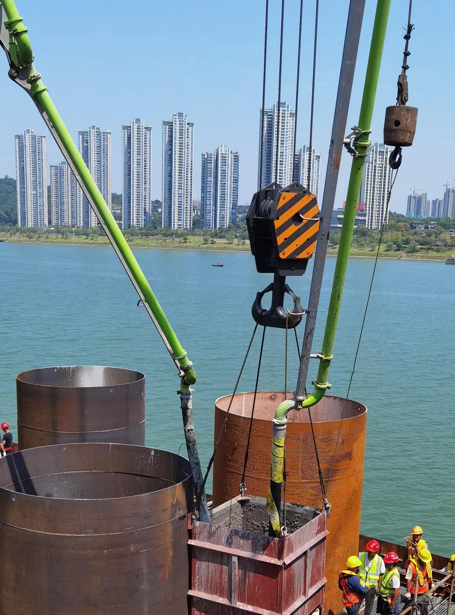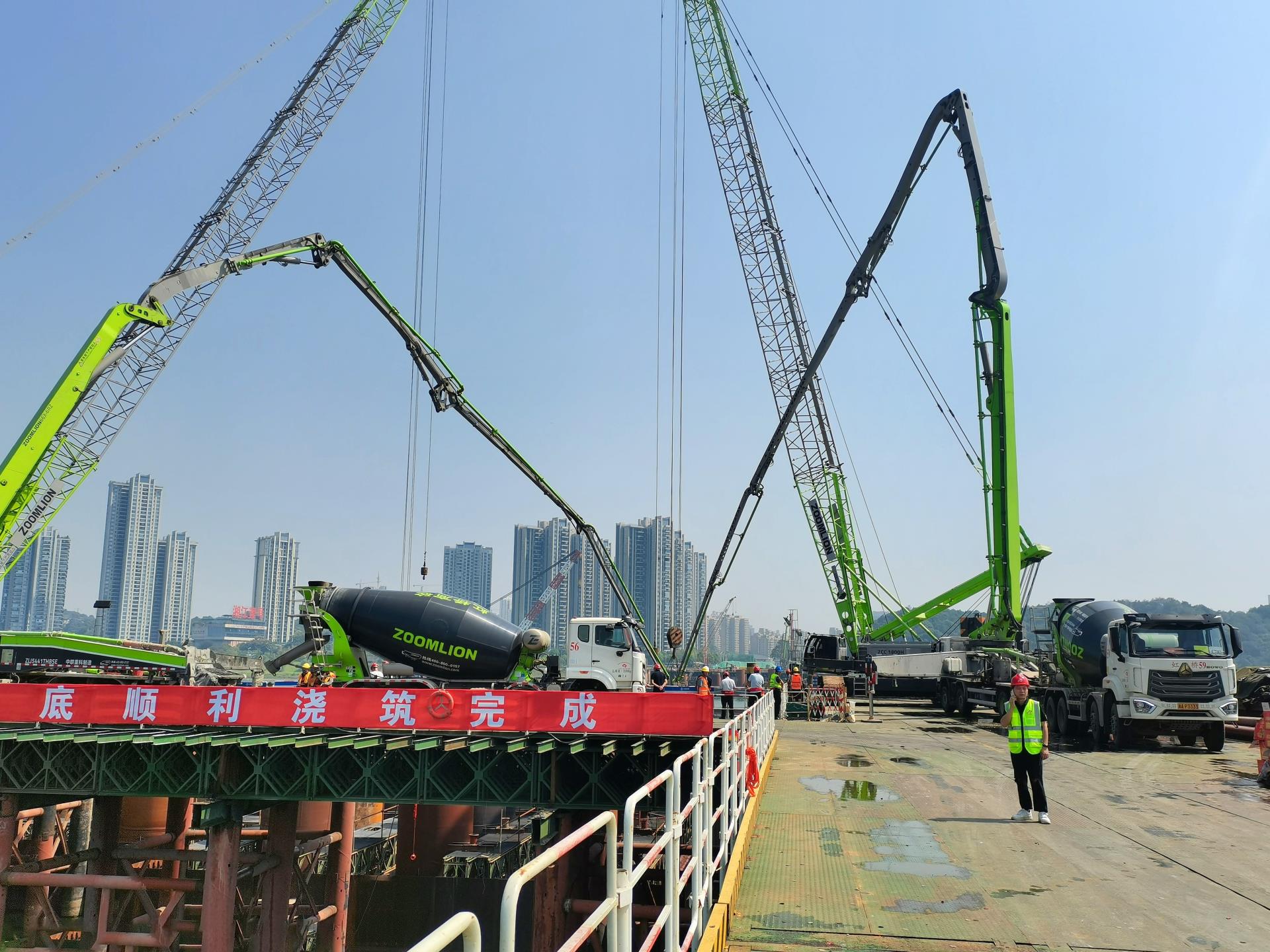 其主墩承臺(tái)設(shè)計(jì)為深埋式“啞鈴型”,鋼圍堰封底工作是**關(guān)鍵、也是連續(xù)作業(yè)時(shí)間**長的工序。為確保澆筑品質(zhì)和效率,施工方經(jīng)多方對(duì)比,**終選擇了中聯(lián)重科“凌云”系列泵車來完成任務(wù)。操作機(jī)手也對(duì)中聯(lián)重科的泵車情有獨(dú)鐘:“中聯(lián)的泵車臂架一直都很穩(wěn),打料快、油耗也低!”
