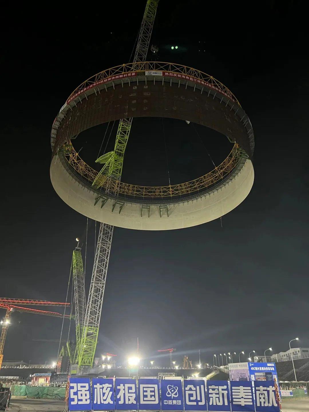 鋼襯里是核電站反應(yīng)堆廠房安全殼的主要組成部分,其吊裝及安裝是核電站建設(shè)中的重要里程碑。此次4號(hào)機(jī)組鋼襯里模塊四整體塑型為偏心圓桶,模塊直徑46.8米,整體高度近10米,吊裝總重量約240噸,就位標(biāo)高精度要求為24.935米。