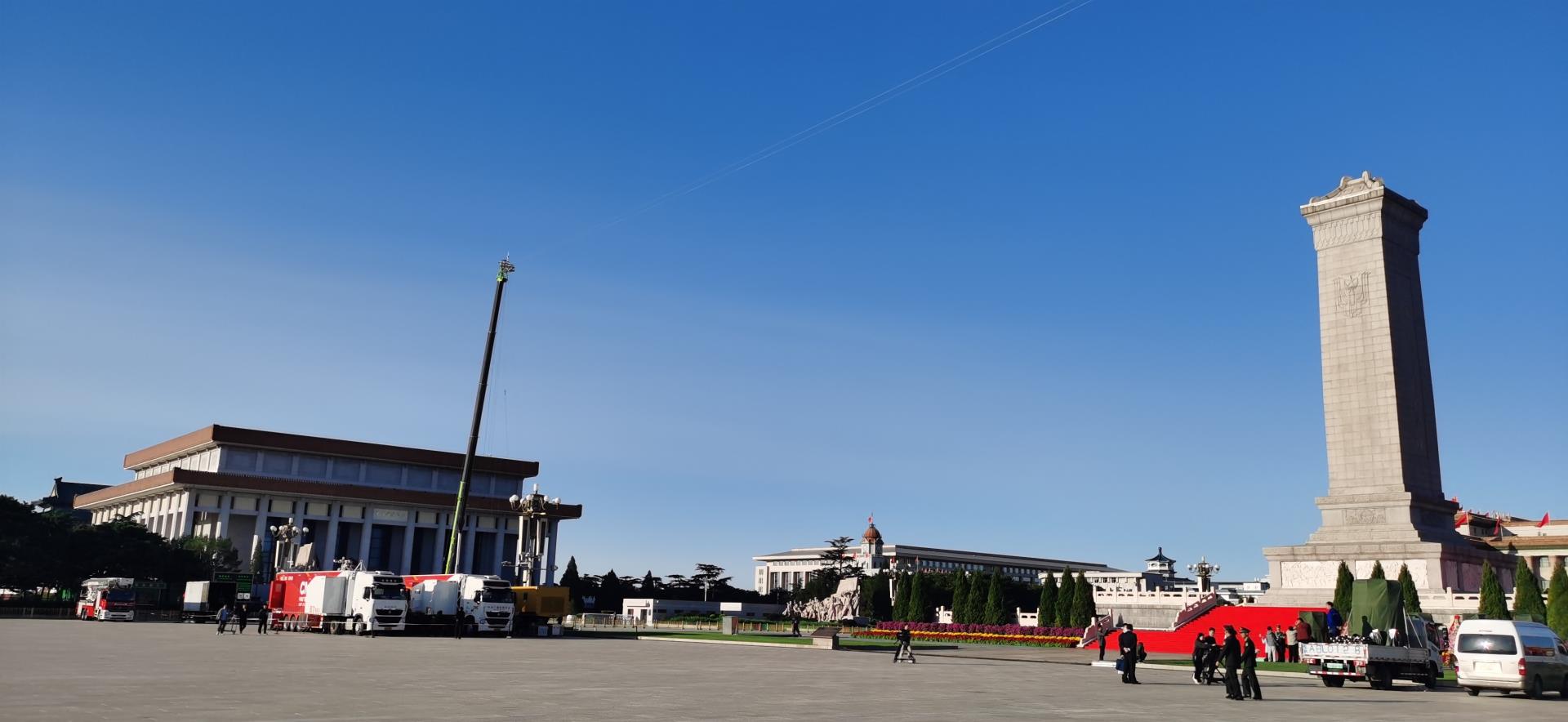 天安門廣場南北兩側(cè),兩臺中聯(lián)重科“極光綠”汽車起重機吊臂高舉,以卓越品質(zhì)和穩(wěn)定性能支撐搭建起一條高40米、長300米的空中索道,其搭載的“天鷹座索道攝像系統(tǒng)”以宏大寬廣的全景視野完美呈現(xiàn)了整場活動,讓全國觀眾更真切地感受儀式的現(xiàn)場氛圍。