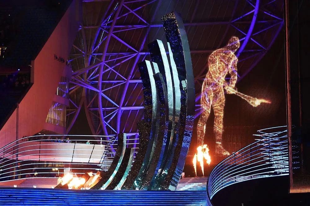 △9月23日,數(shù)字火炬手在點(diǎn)燃主火炬(圖片來源:新華社)