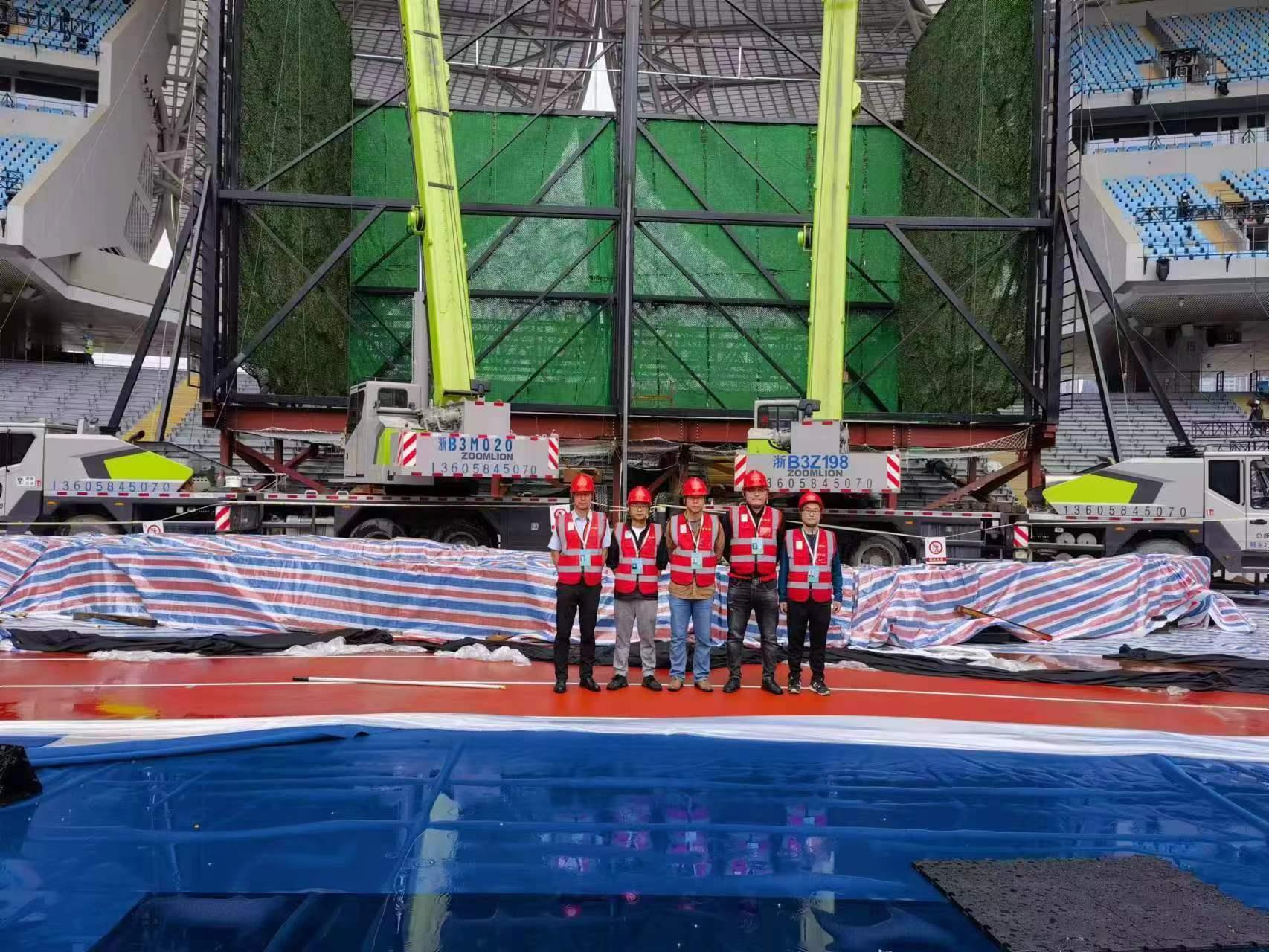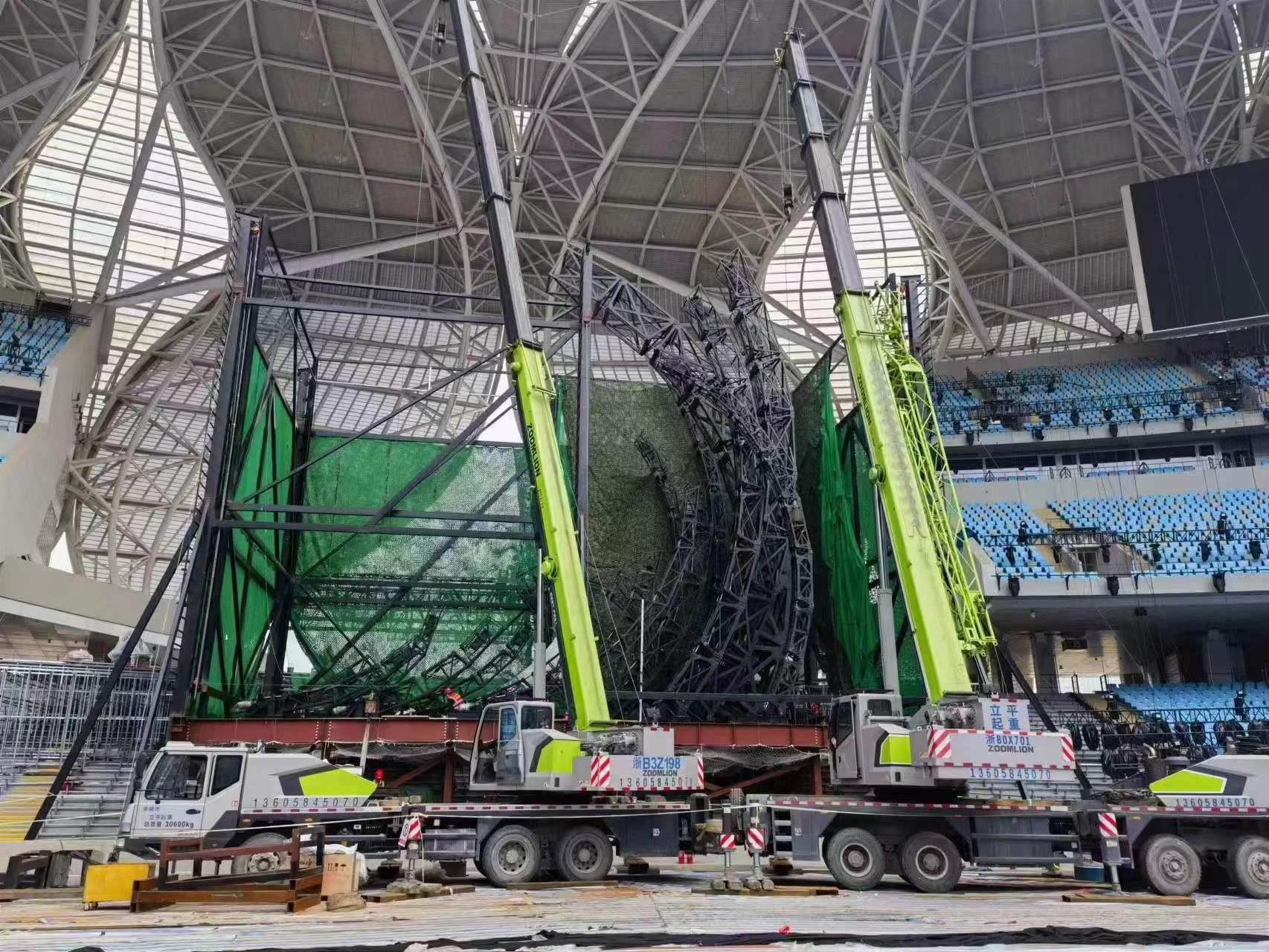 “作為亞運(yùn)會主火炬塔創(chuàng)制者大豐實(shí)業(yè)的合作單位,這次我們總共派出了3臺中聯(lián)重科吊車,一臺50噸、兩臺25噸。主火炬塔立柱**高達(dá)19米,所有立柱形狀不規(guī)則且有弧度,在21 x 10米的場地上吊裝,對吊車的穩(wěn)定性、微動性和吊裝的精準(zhǔn)度要求非常高,對接精度需要達(dá)到毫米級。從4月中旬進(jìn)場到6月初,中聯(lián)重科起重機(jī)憑借強(qiáng)大的工況適應(yīng)性,全程以穩(wěn)定、高效、可靠的表現(xiàn),圓滿完成此次安裝任務(wù)?!庇嘁α⑵狡鹬匕惭b有限公司負(fù)責(zé)人周曉黎介紹說。