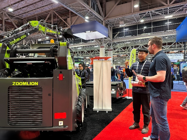 以土方機械產(chǎn)品為例。此次中聯(lián)重科攜ZE35GU挖掘機及ZS090V滑移裝載機兩款微小型設備及多款屬具參展,其針對北美市場在多方面做出適應性改進,更緊密契合當?shù)乜蛻舻男枨蠛拖埠谩F渲?,ZE35GU挖掘機采用更堅固的底盤結構和強化工作裝置,定制化的負載敏感液壓系統(tǒng)提高了整機作業(yè)微控性;ZS090V滑移裝載機可原地轉向,模塊化設計使它能夠搭載200余種功能屬具,從而實現(xiàn)小空間、多功能、多場景施工。北美客戶對兩款產(chǎn)品表現(xiàn)出濃厚興趣,前來試乘詢單的客戶絡繹不絕。